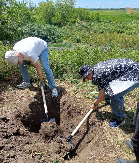 Для ознакомления с процессами остепнения и преобразования гидроморфных и полугидроморфных (аллювиально-луговых) почв в автоморфные мы отправились в окрестности станицы Старочеркасской в Доно-Аксайскую пойму, где сделали прикопку, мощность которой определилась по глубине слитого горизонта.
