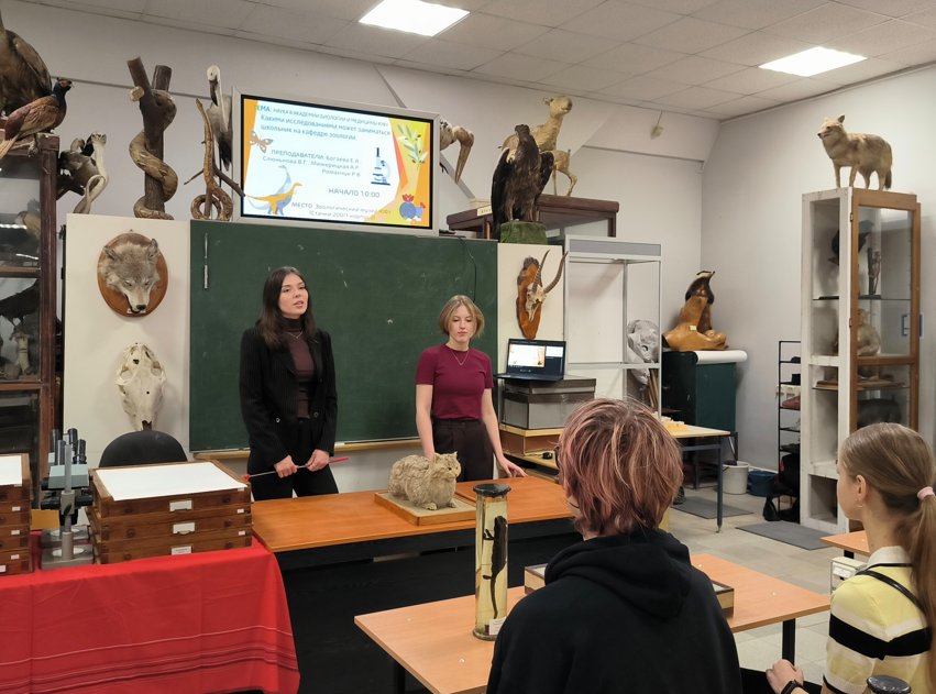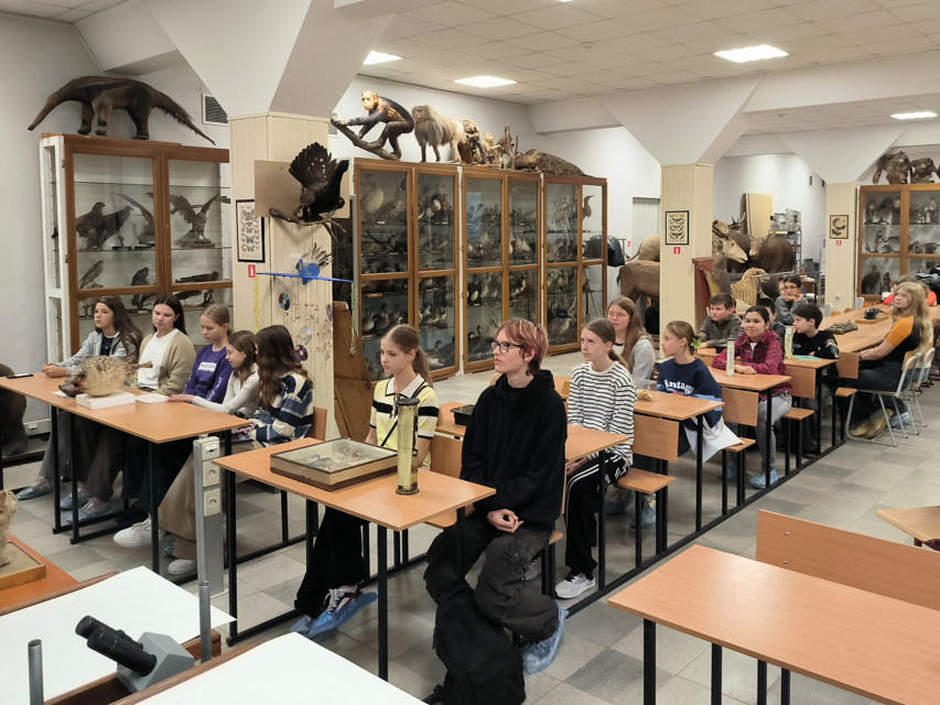 Вводное занятие на тему «Чем могут заниматься школьники на кафедре зоологии» провел старший преподаватель Романчук Роман Викторович, рассказавший ребятам об основных направлениях изучения беспозвоночных и позвоночных животных, о взаимодействии школьников с учеными, преподавателями и студентами кафедры зоологии. В дополнение к лекции школьникам был показан демонстрационный материал Зоологического музея ЮФУ и проведена экскурсия в свободной форме.