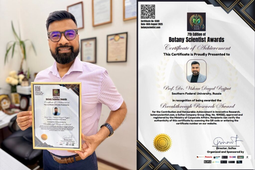 Главный научный сотрудник Академии биологии и биологии Д.И. Ивановского ЮФУ Вишну Д. Раджпут, PhD, руководитель фронтирной лаборатории «Биоинженерия ризосферы», созданной при поддержке Программы стратегического академического лидерства Южного федерального университета «Приоритет-2030» удостоен престижной награды за «прорывные исследования» в области нанобиоинженерии почв и «International Botany Scientist Awards».