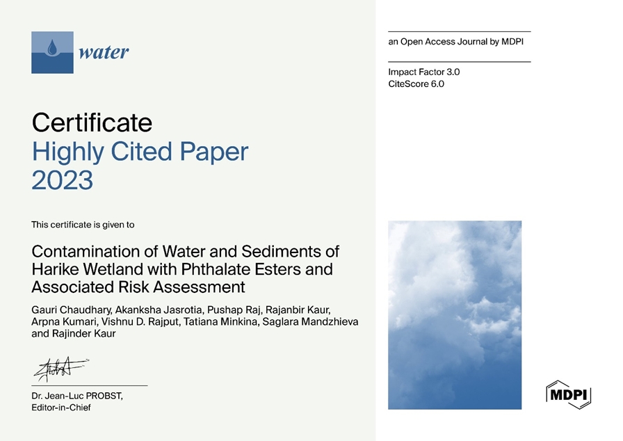 Научная статья «Contamination of Water and Sediments of Harike Wetland with Phthalate Esters and Associated Risk Assessment», опубликованная в журнале Water в 2023 году, посвящена исследованию загрязнения водно-болотной экосистемы Харике (Индия) фталатными эфирами — опасными химическими соединениями, широко применяемыми в качестве пластификаторов при производстве пластмасс. В ходе работы ученые выявили значительные концентрации этих веществ в воде и донных отложениях, провели комплексную оценку экологических рисков и проанализировали потенциальное воздействие загрязнителей на здоровье человека и состояние природных экосистем. Высокая актуальность результатов и их значимость для глобальной экологической повестки обусловили широкое цитирование публикации в научном сообществе, что и стало основанием для присуждения ей статуса одной из наиболее цитируемых статей журнала 2023 года.
