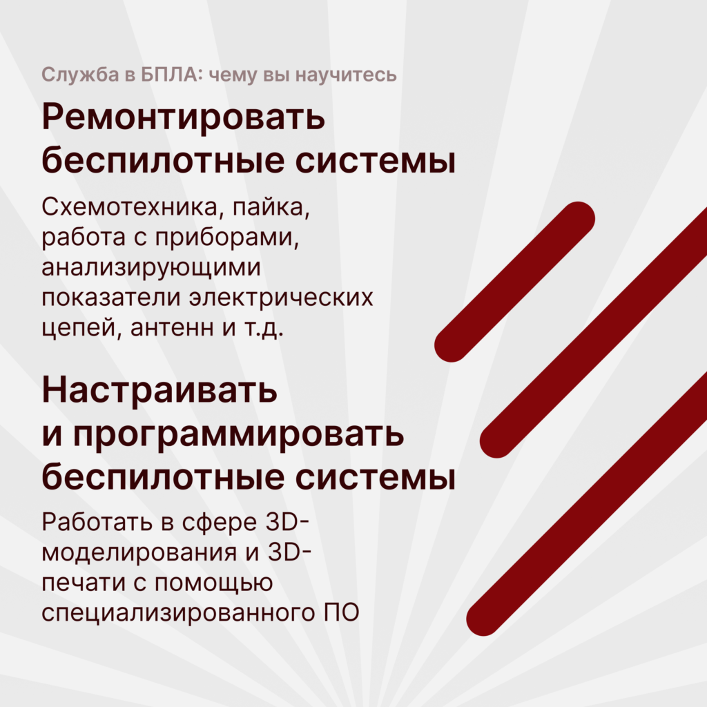 Настраивать и программировать дроны. Вы будете работать в специализированном ПО, создавать модели и печатать необходимые детали на 3D-принтерах прямо в подразделении.