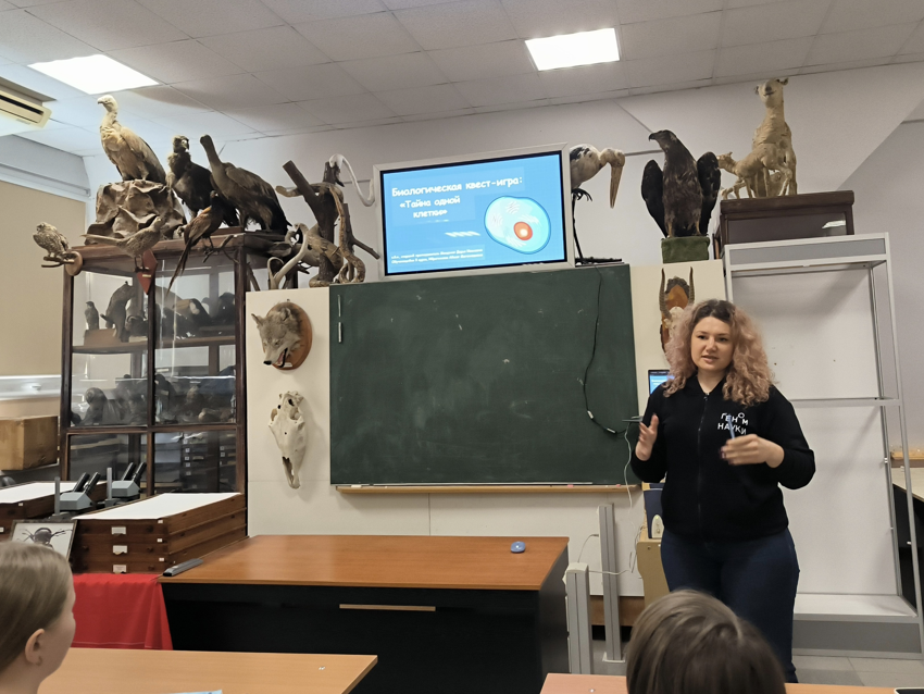 Кандидат биологических наук Мощенко Дарья Ивановна и студентка 5 курса педагогического направления Ибрагимова Айшат провели ребятам интерактивную игру-детектив «Тайна одной клетки». Школьники детально изучили строение растительной, животной, грибной и бактериальной клеток, узнали о функциях органоидов и в итоге вычислили того, кто украл вакцину из лаборатории Академии биологии и медицины!